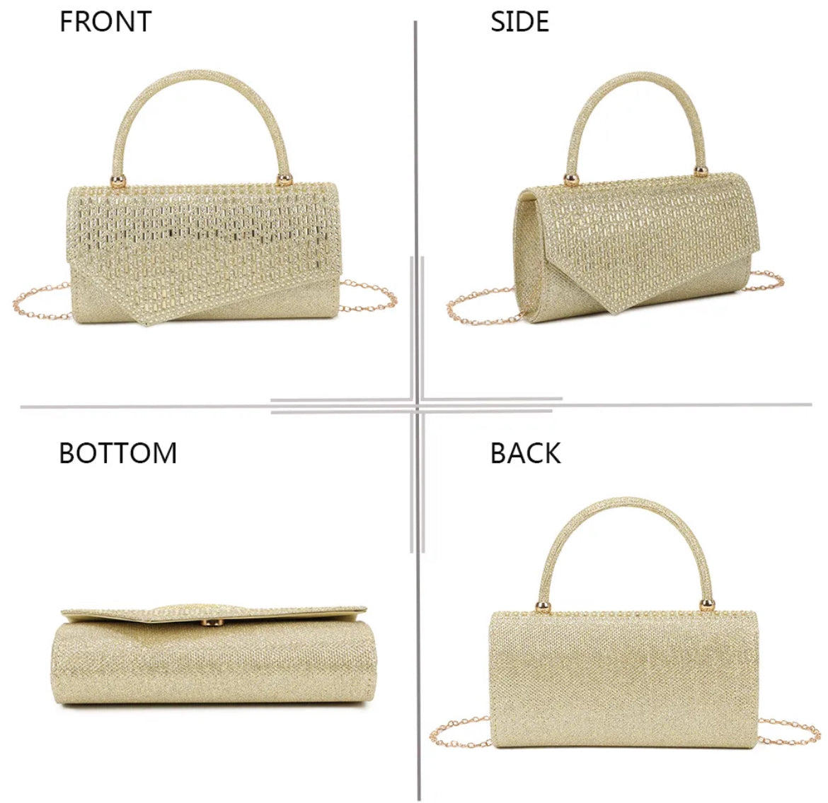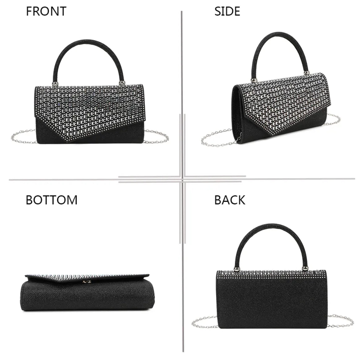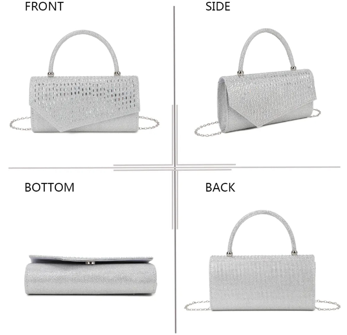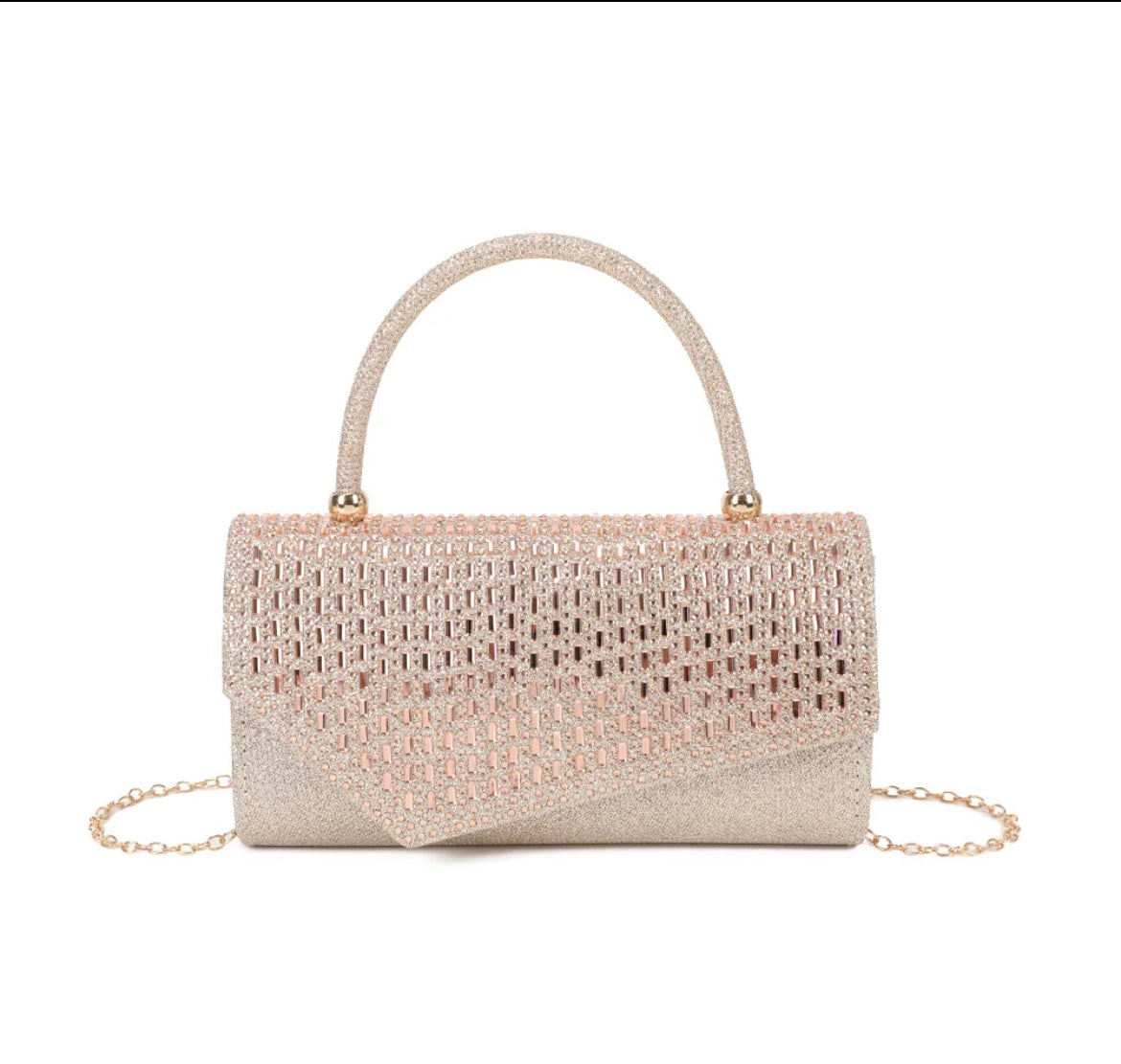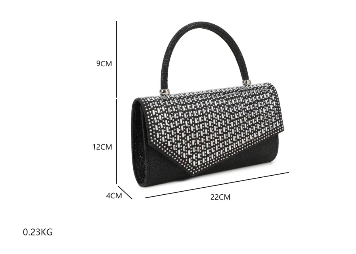 Une pochette au design sophistiqué, ornée de détails scintillants qui captent la lumière à chaque mouvement. Ce modèle allie glamour et modernité pour sublimer vos looks de soirée.