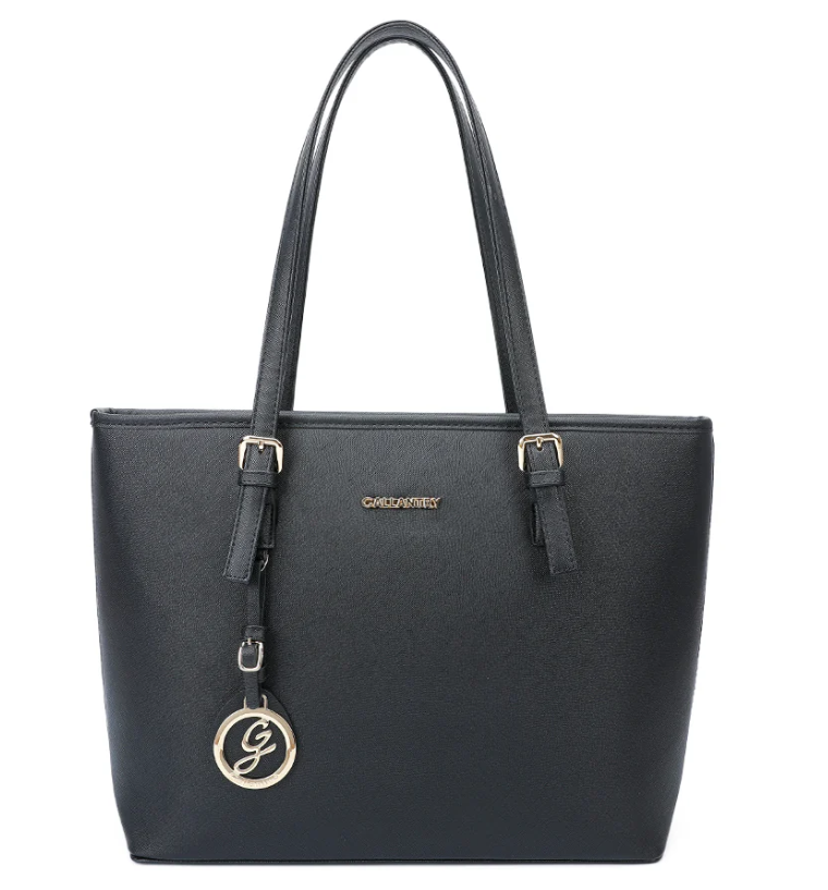 Sac cabas Gallantry – Simili cuir grainé noir, cabas spacieux avec pendentif logo doré