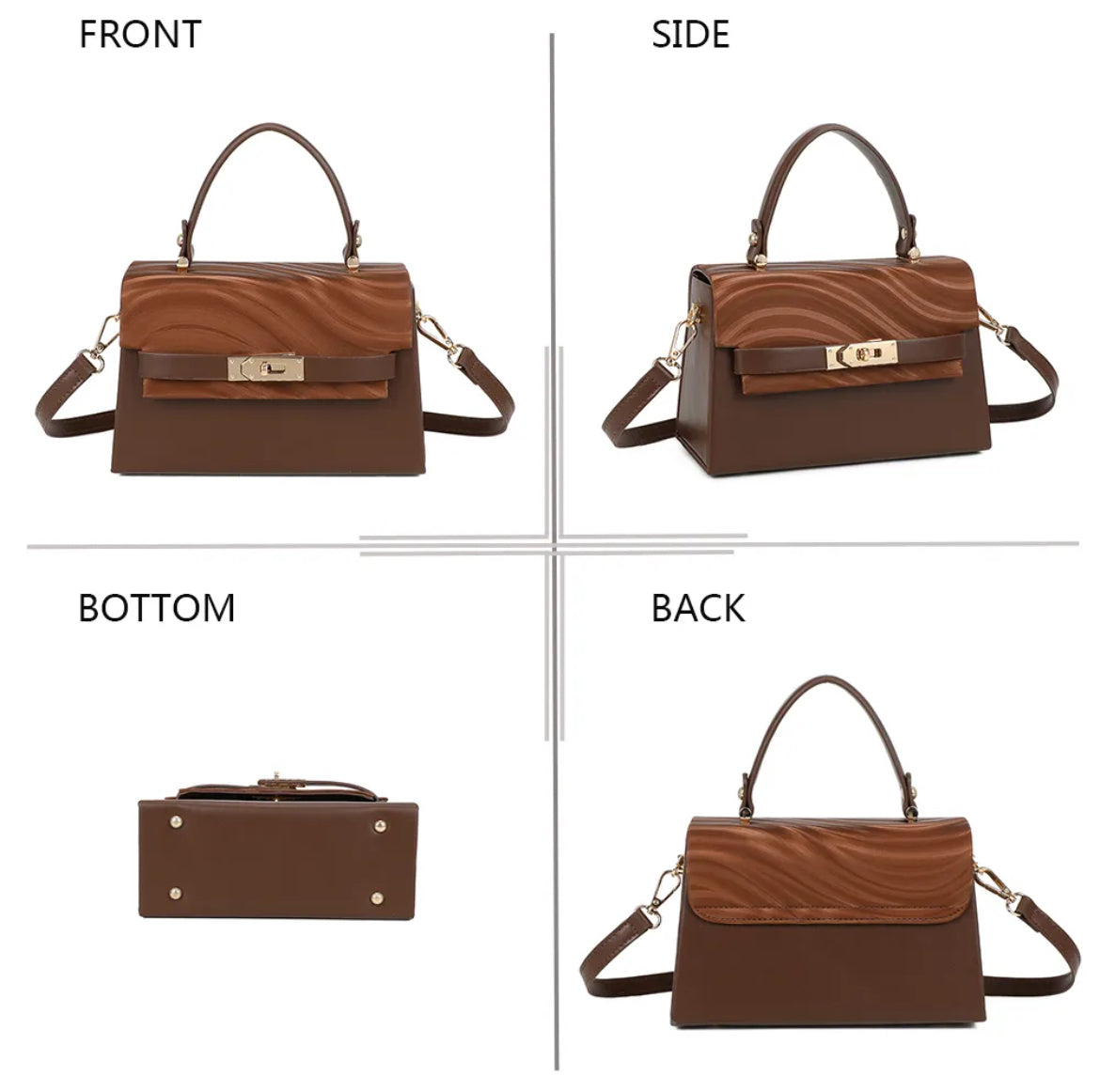 Ce modèle Gallantry se distingue par son design unique et raffiné, mêlant une finition effet bois ondulé sur le rabat et un cuir lisse structuré.
