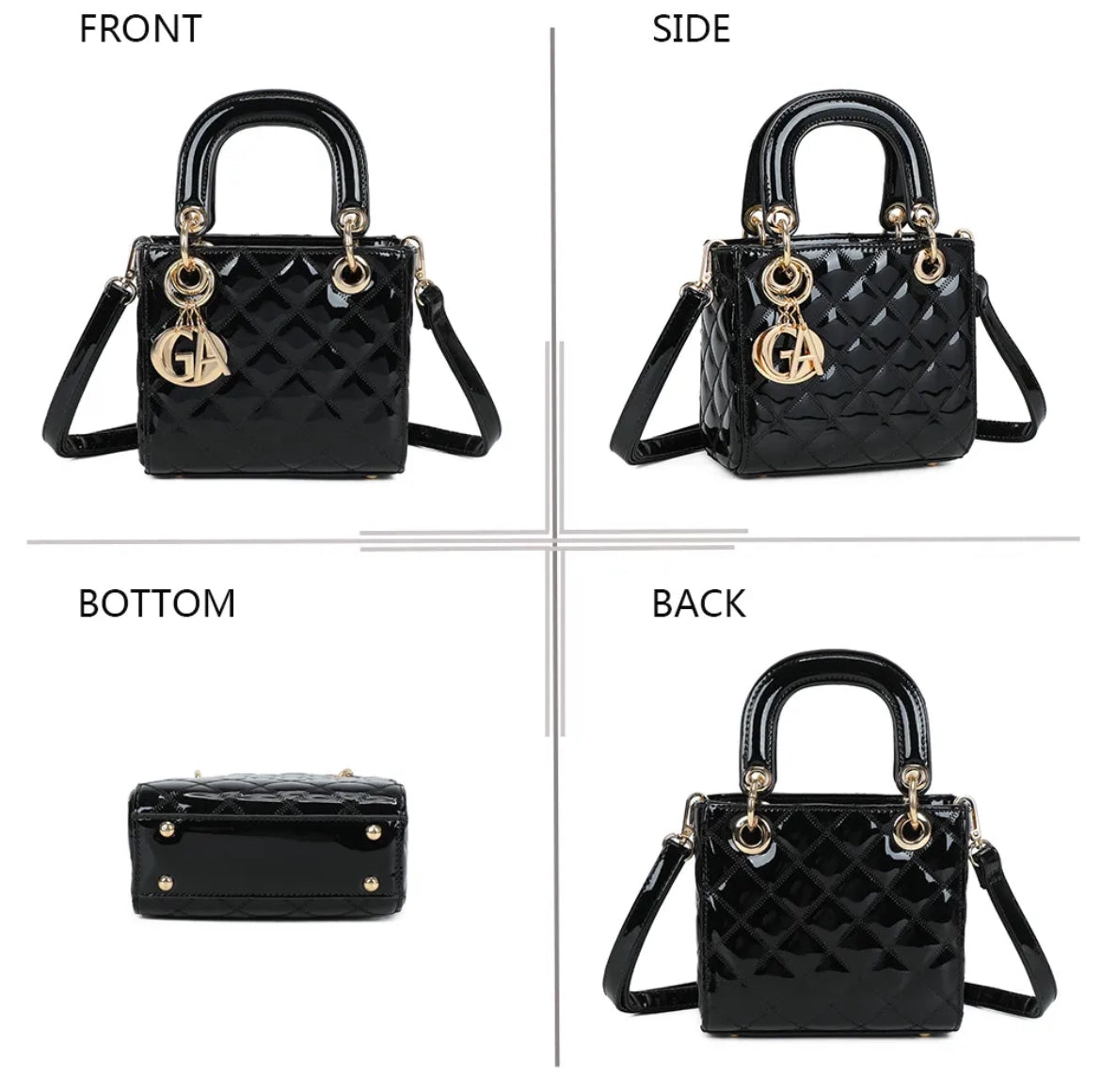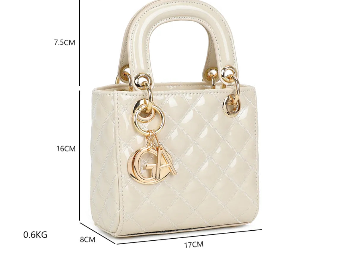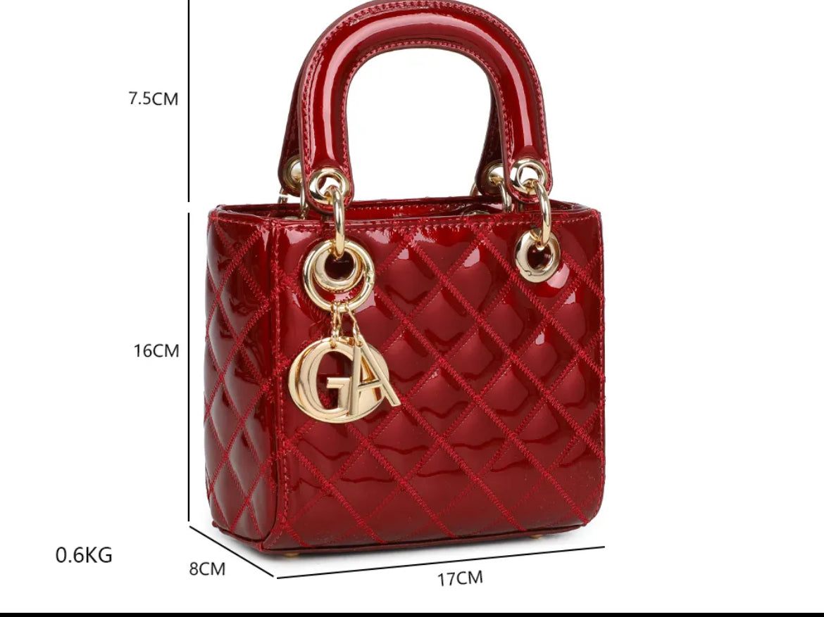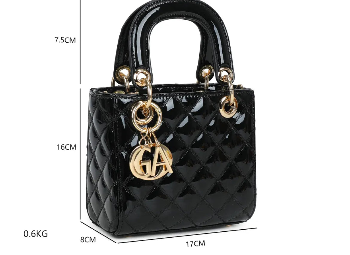 ✔️ Design chic et moderne : cuir verni matelassé, finitions dorées et pendentif emblématique GA pour un rendu luxueux.