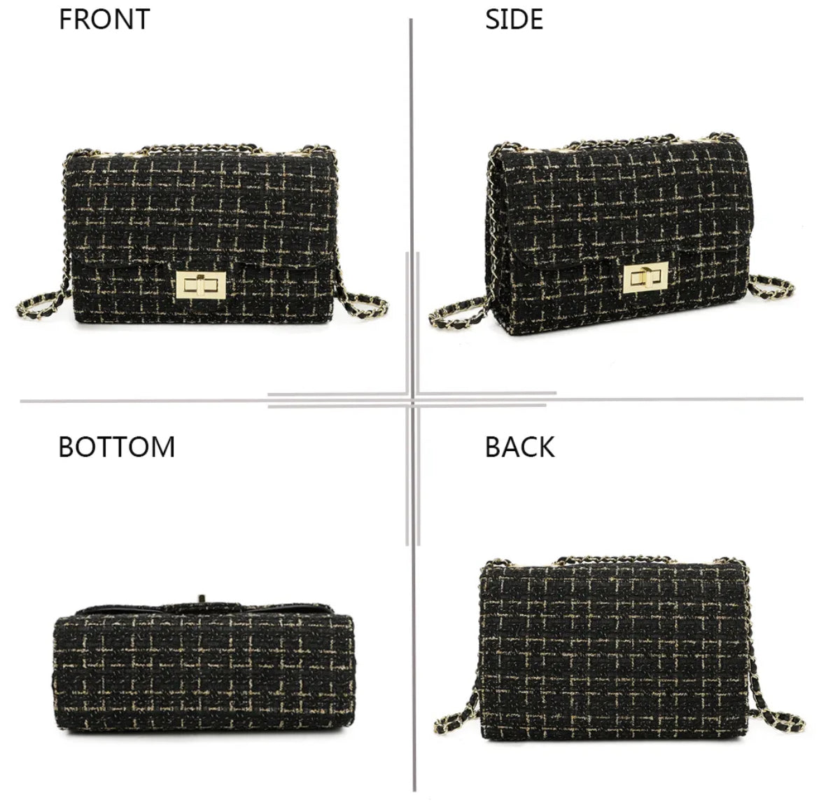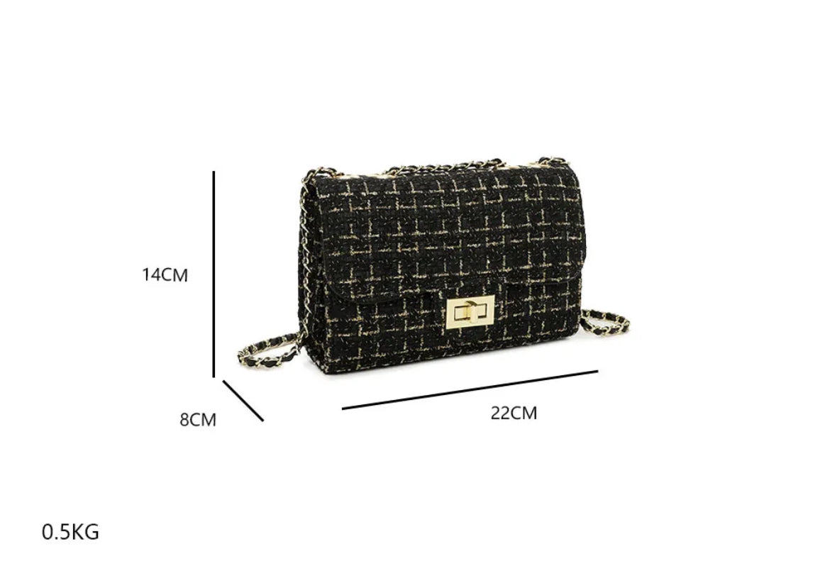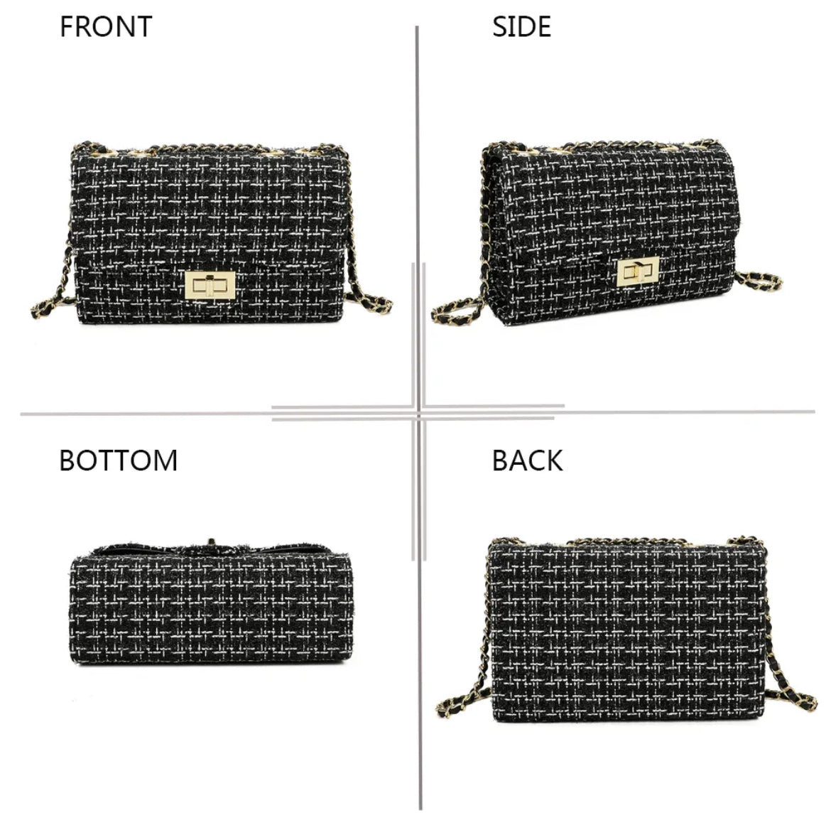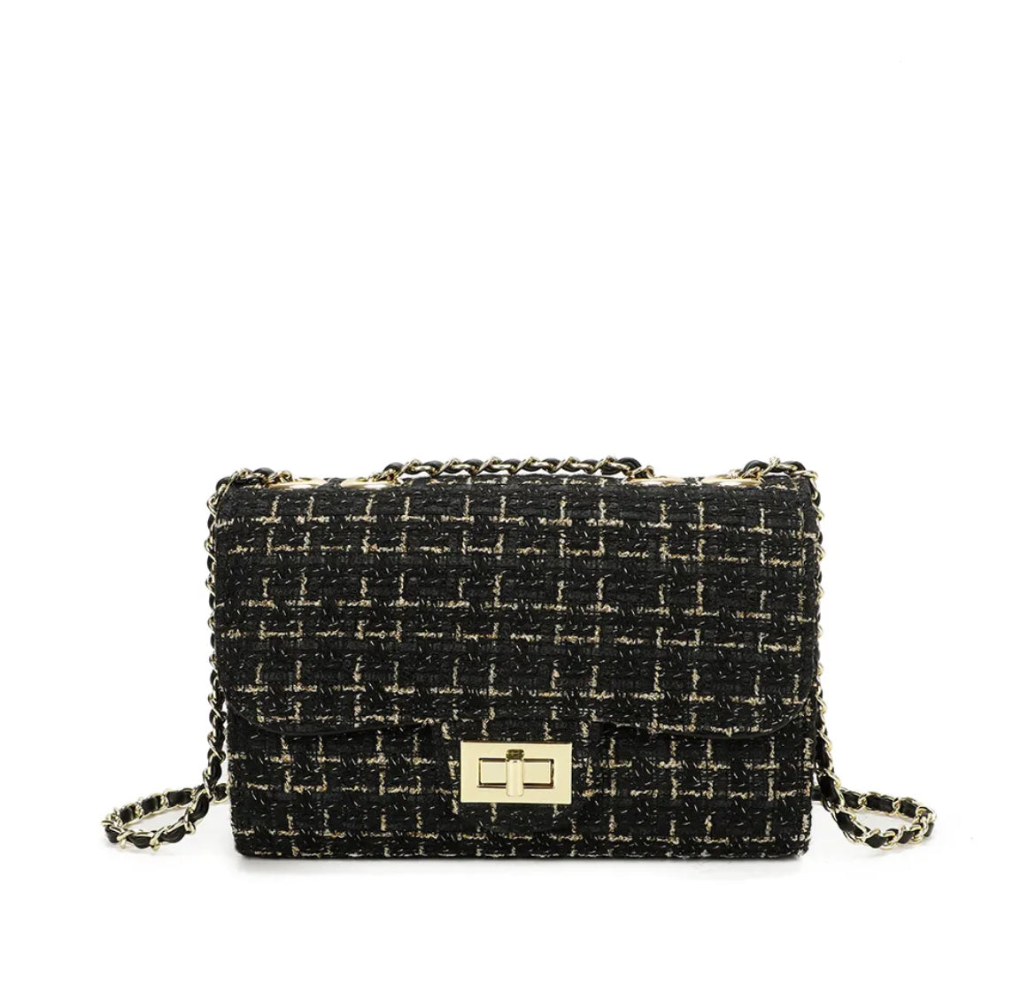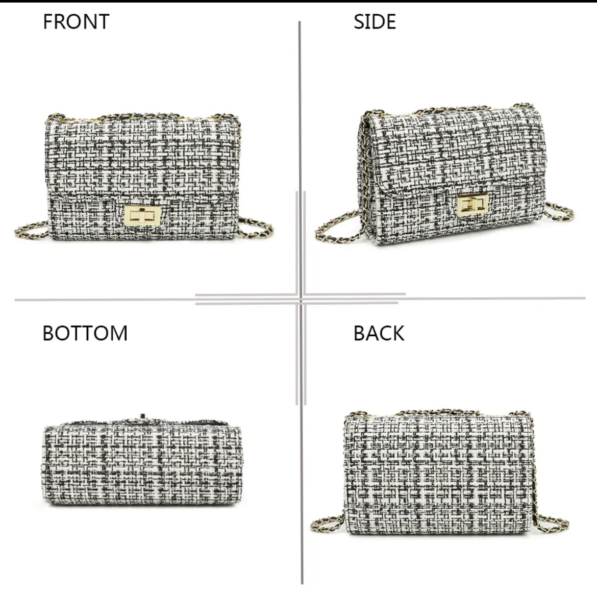 ✔️ Design unique : matière tweed noir et blanc, rehaussée d’un fermoir doré moderne.