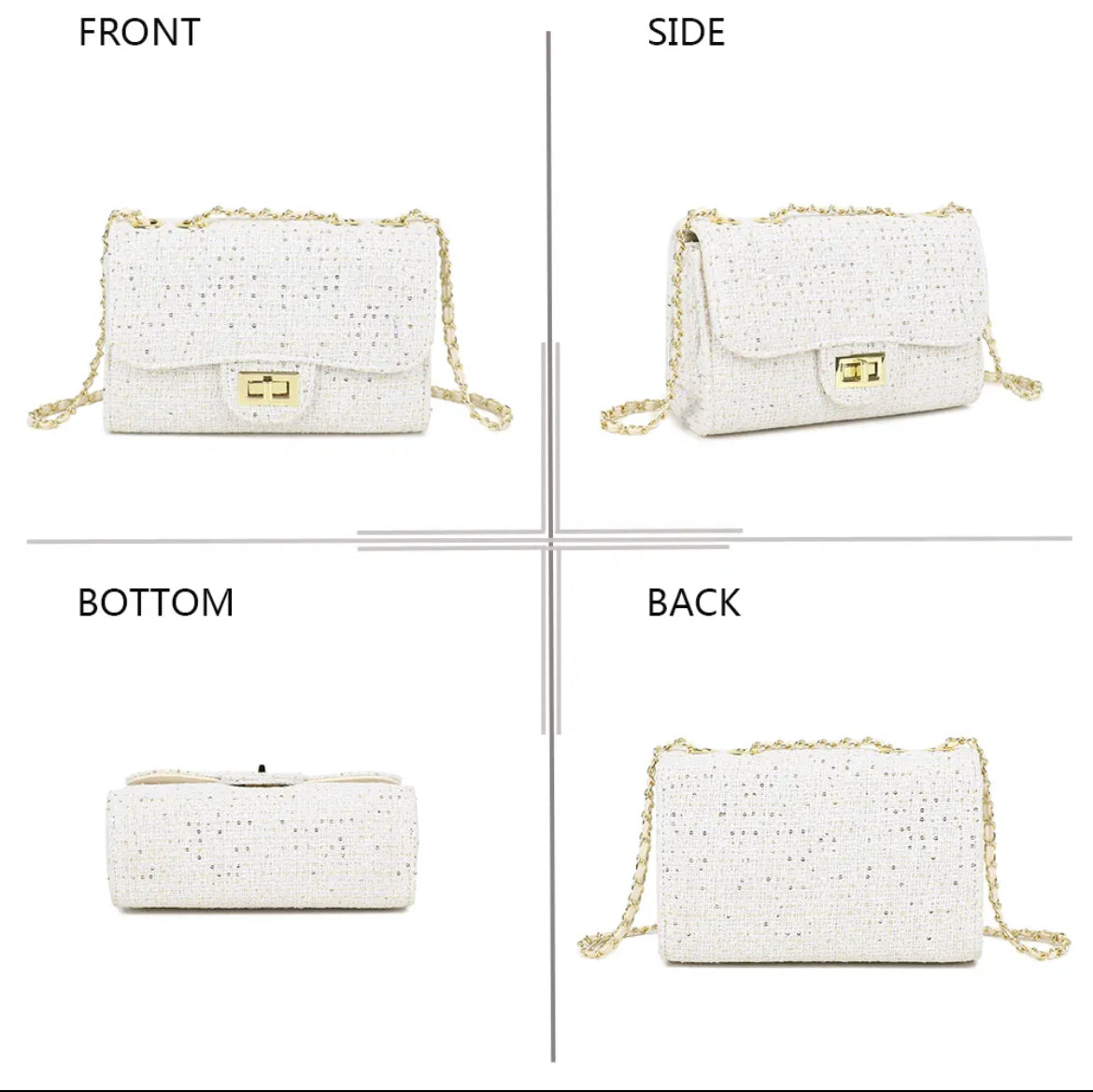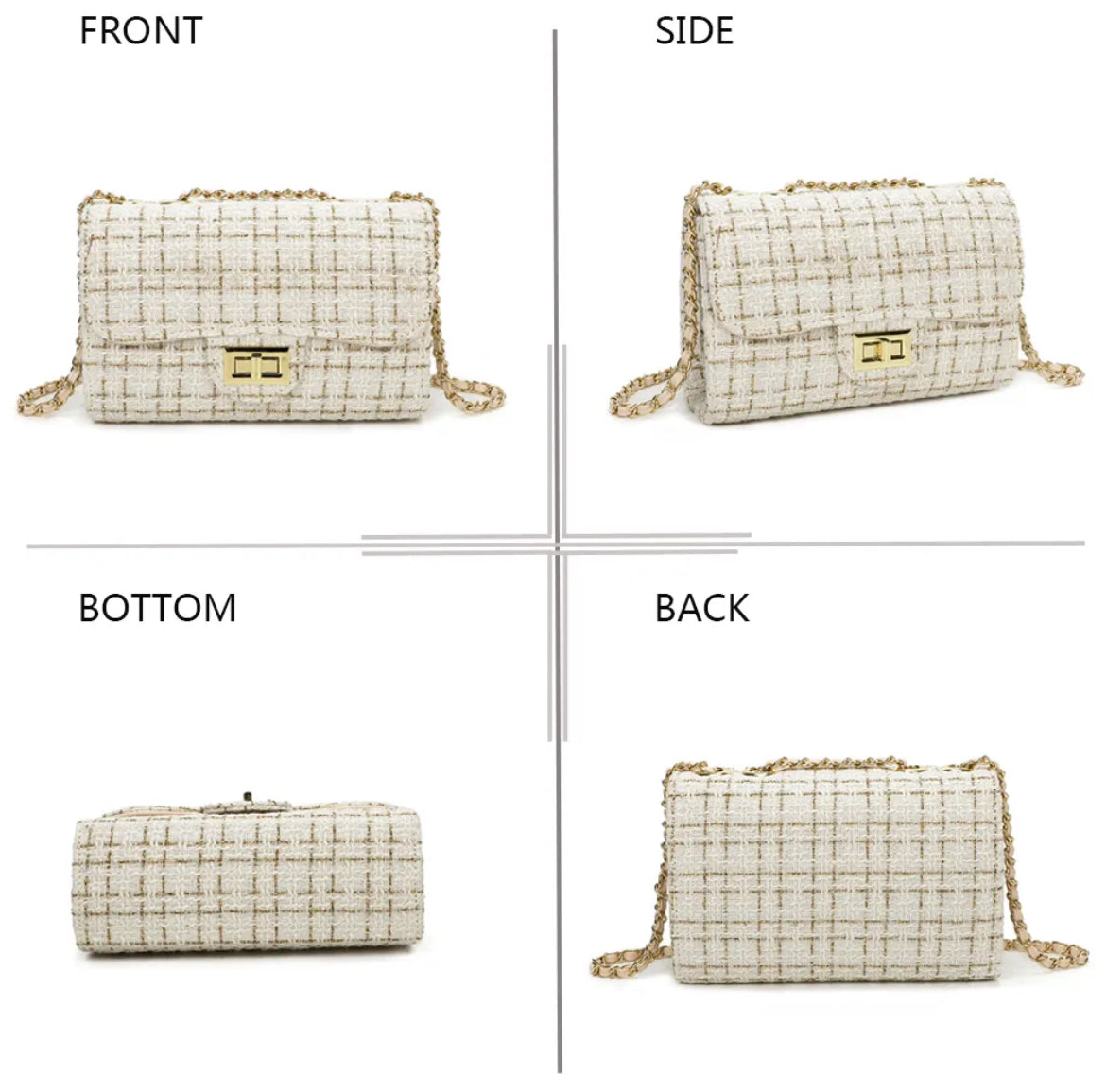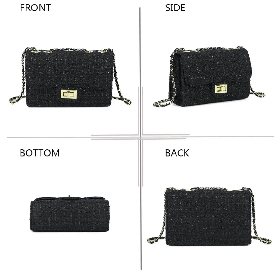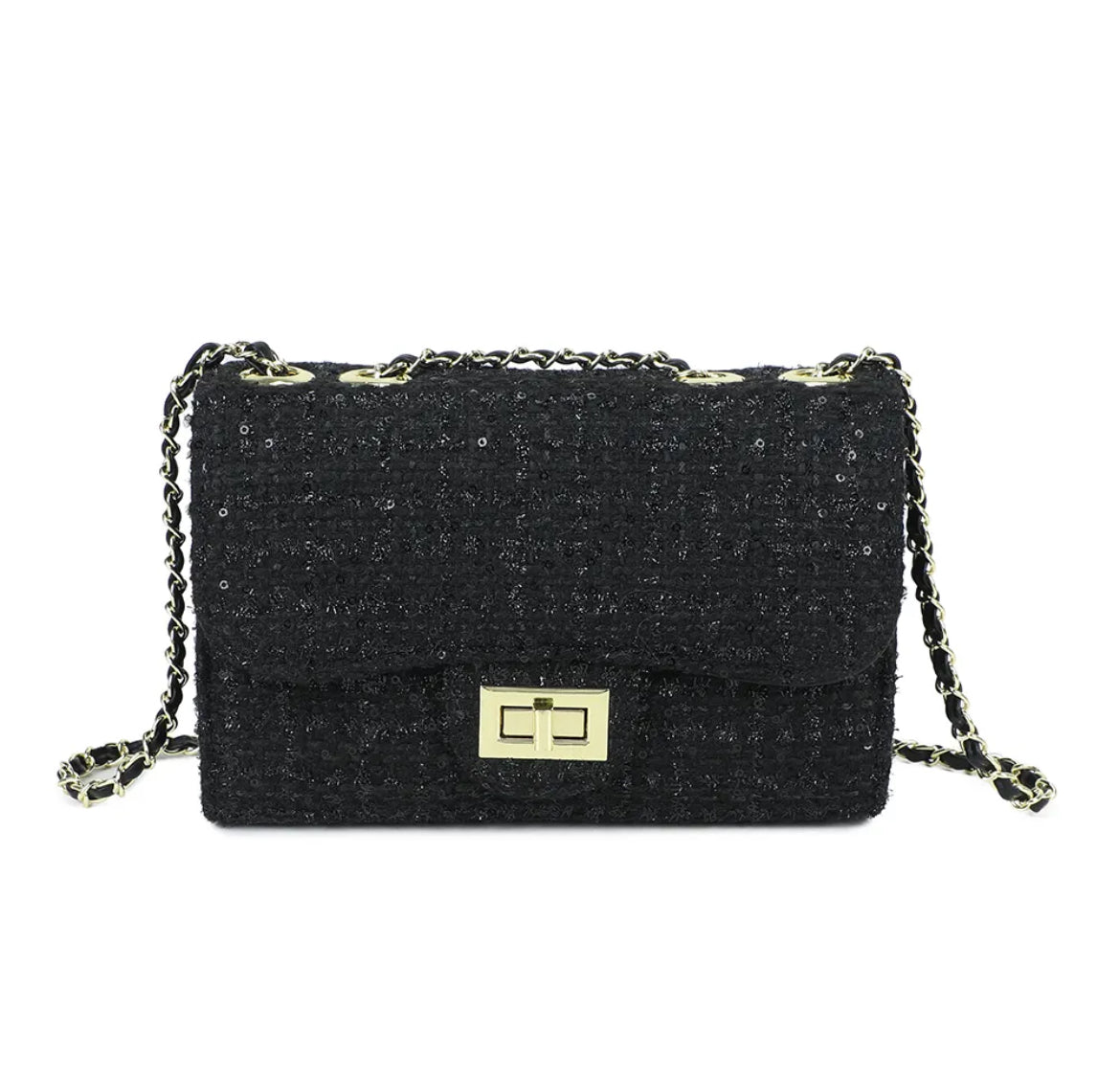 ✔️ Design unique : matière tweed noir et blanc, rehaussée d’un fermoir doré moderne.